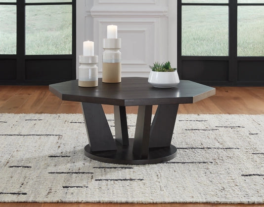 For the ultimate in casual contemporary styling, accent your sofa or loveseat with this chic coffee table. Designed with an octagonal top and trapezoid-shaped legs, its geometric elements create a bold, eye-catching look.