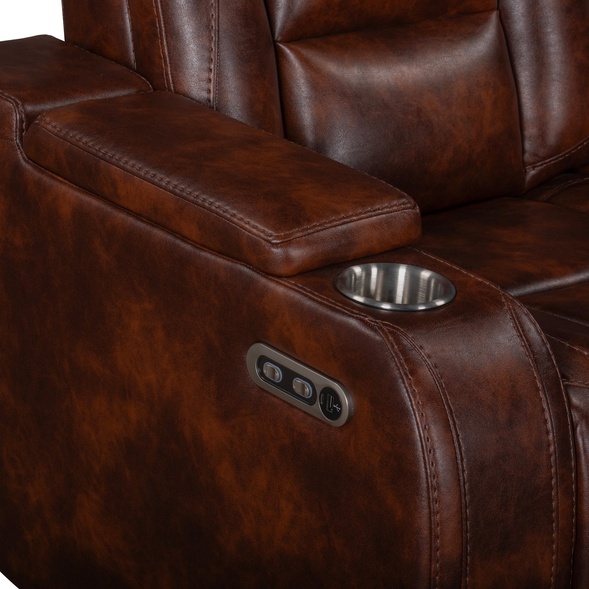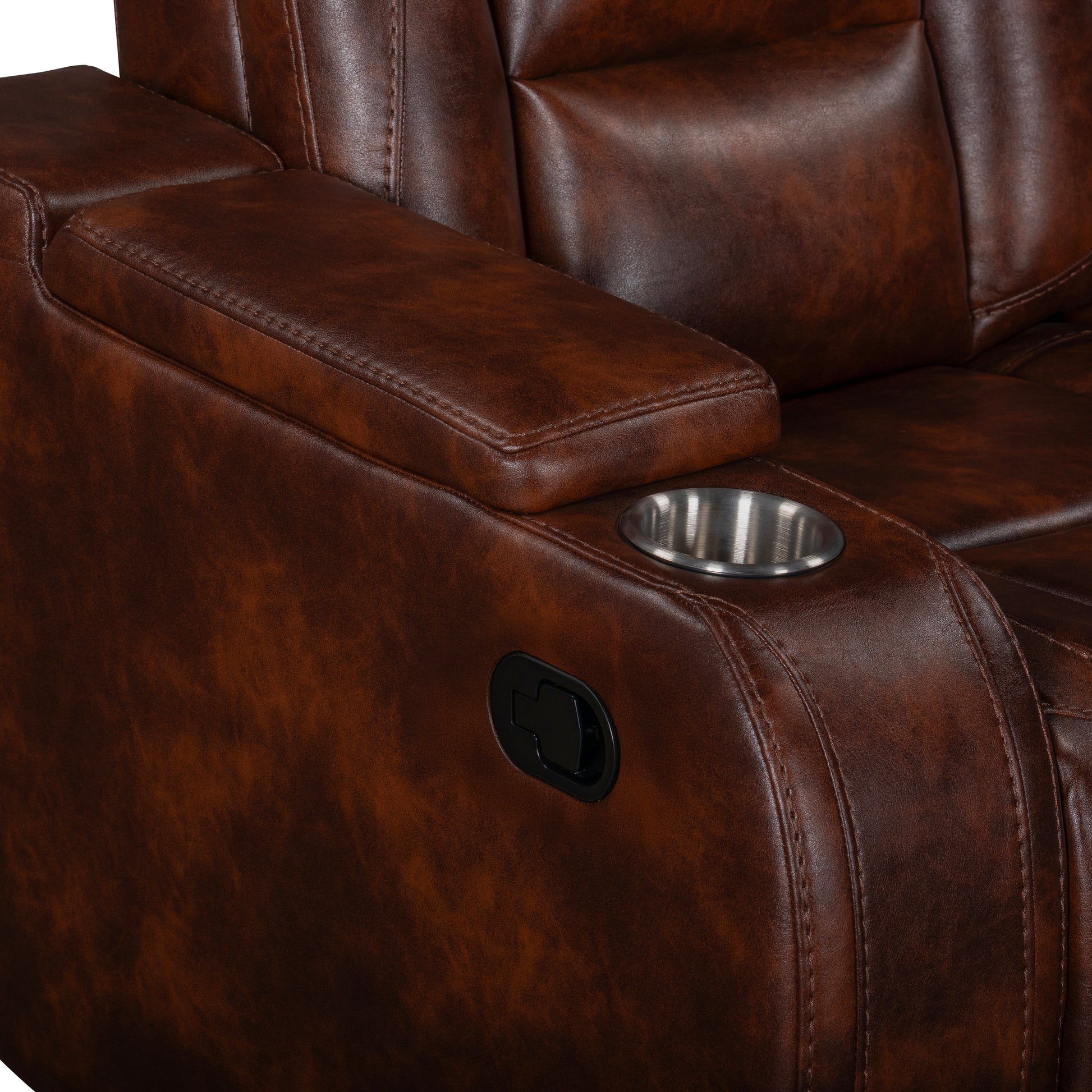 The Chester Reclining Console Loveseat in brown combines modern aesthetics with superior comfort and practical features. Constructed with hardwood and plywood interior frames and sturdy motion mechanisms, this loveseat offers a durable foundation, accommodating up to 350 pounds per seat. Its rich brown color and clean lines bring a contemporary appeal to any living space. The supportive seating features a blend of springs and plush foam, ensuring consistent comfort and maintaining the loveseat’s shape over time. The soft, PU synthetic leather fabric is both durable and easy to maintain, resistant to stains and scratches. With two recliners, you can effortlessly find your perfect position, making it ideal for living rooms and home theaters. Additional lifestyle features include storage arms and a center console for remotes or books, along with built-in drink holders for added convenience. The Chester Reclining Console Loveseat offers unparalleled comfort and functionality, making it an excellent choice for your home.