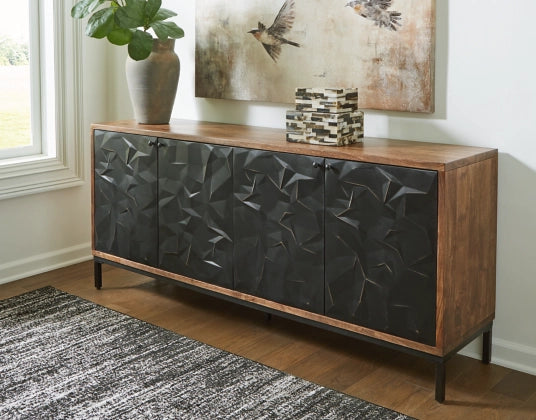 Revamp your home with this stylish accent cabinet. Featuring four doors with a captivating textured pattern, it instantly becomes the centerpiece of your room. The cabinet's interior shelves make it versatile for use as a buffet, console or media cabinet. It's a smart choice that elevates your home on multiple levels.