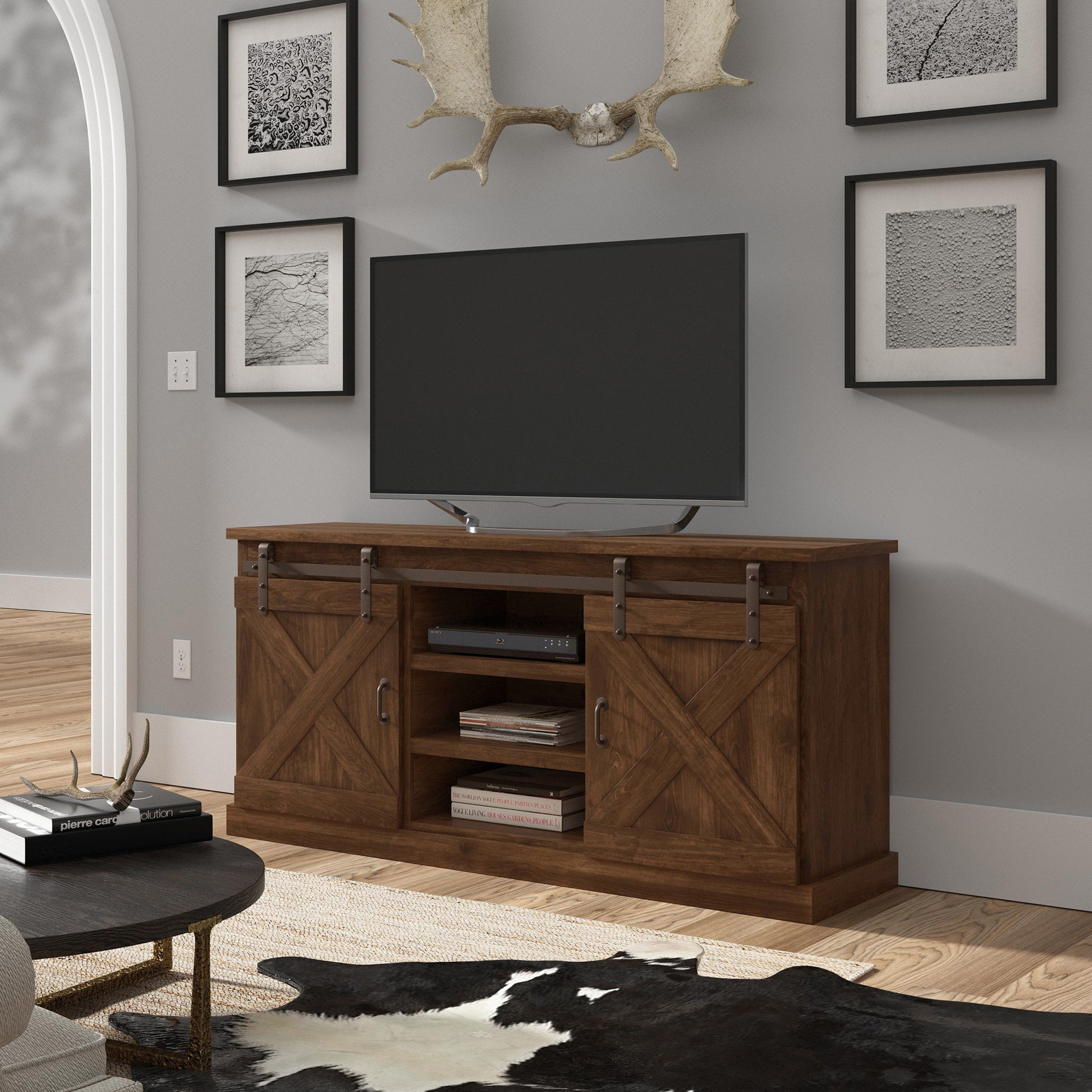 The Farmhouse 66" TV Stand features charming rolling barn doors and stylish metal accents, embodying the essence of rustic farmhouse decor. Designed to support TVs up to 80 inches, it offers ample storage for all your media components. Its classic appeal makes it a perfect addition to any home seeking a touch of simplicity and nostalgia.