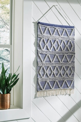 With boho-chic design in mind, this woven wall hanging adds eye-catching texture to your living space. Its diamond design, decorative fringe trim and shades of blue and gray will add interest to your wallscape, inside or out.