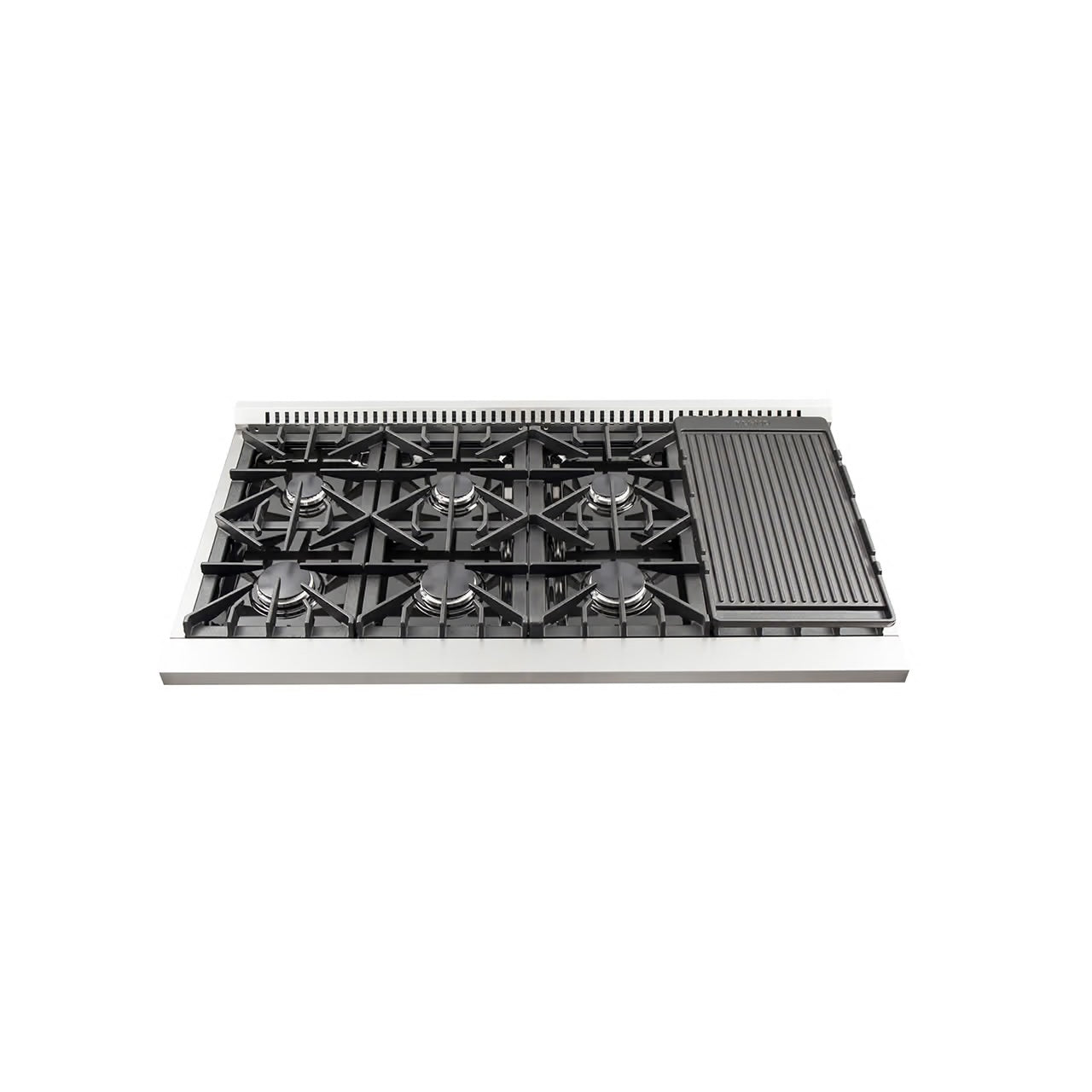 48 in. Galiano Professional Gas Range with 8 Sealed Burners Take your cooking to new heights and cook up some culinary perfection and feel like an expert in your own kitchen with this Alta Qualita 48 in. Gas range. This freestanding gas range provides a eight-burner configuration with continuous grates that allows you to quickly slide pots and pans across the range. The burners range from a 9,000 BTU to 20,000 BTU, so you can easily control the heat and intensity with which you are cooking. The convection oven features 6.58 cu. ft. of capacity, along with a top-mounted broiler for even heat distribution, U Tube Auto-Ignition Convection Fan, 2 oven racks, and 2 halogen oven lights. The LP conversion kit is included in this package if you plan to switch between propane and natural gas in the future.