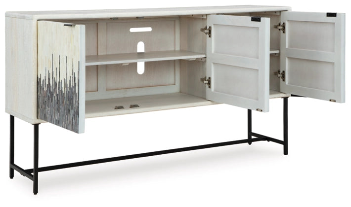 Looking for a showstopping accent for your home? This accent cabinet combines fashion and function in an exclusive way. It offers a creative take on a traditional cabinet, with a strip pattern in white, gray and black. Inside the doors, two shelves suit all your storage needs. Redefine your modern decor with this one-of-a-kind piece.