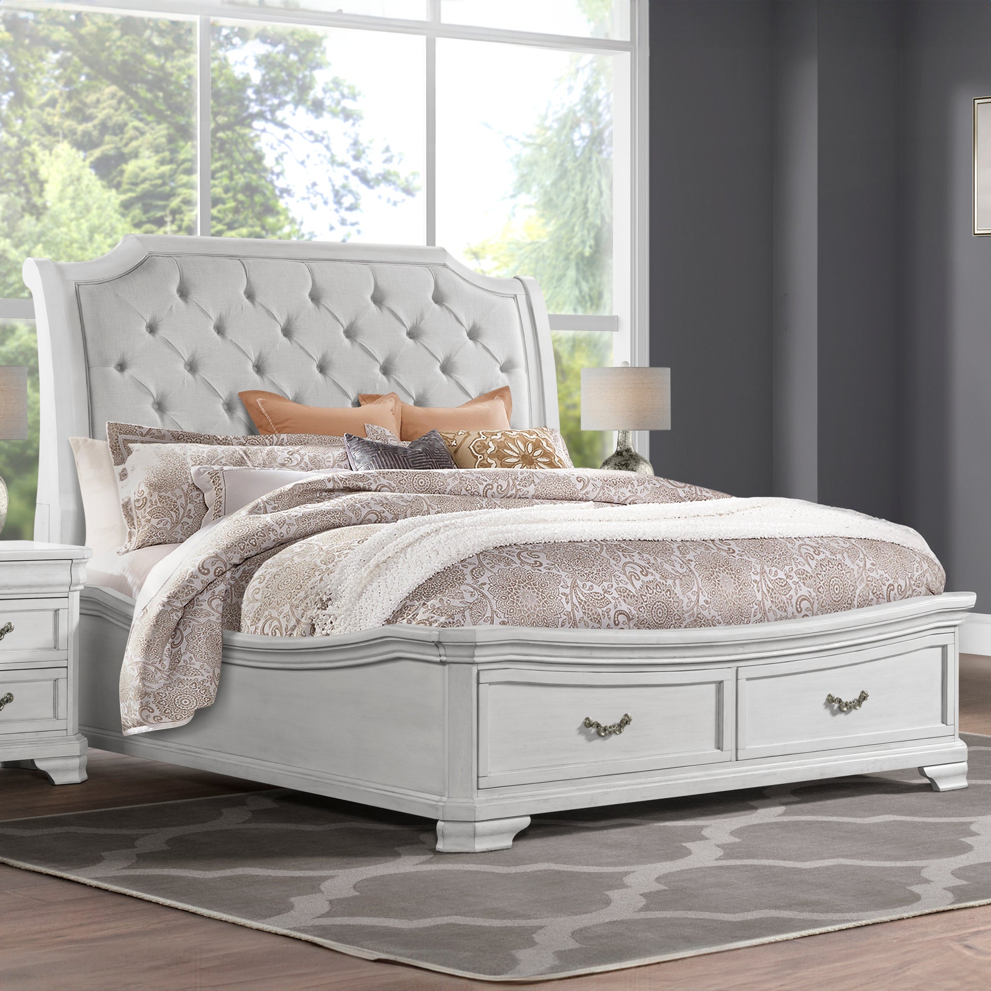 - Luxurious Sleigh Styling: Lounge comfortably against the sweeping sleigh style headboard, covered in 100% polyester upholstery. Stow extra linens in the convenient, space saving storage footboard.