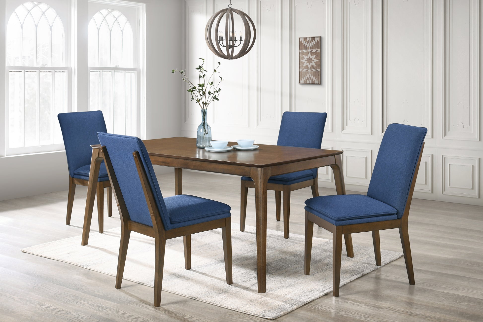 The Maggie Collection seamlessly blends modern design with exceptional craftsmanship, creating a dining experience that’s both stylish and durable. Each table is constructed from solid Rubberwood and genuine Oak wood veneers, ensuring longlasting strength and natural beauty. The rich walnut brown finish, achieved through an intricate multistep process, highlights the wood’s unique grain, adding depth and warmth to your dining space. The Parsons dining chairs, designed for both elegance and comfort, feature fully upholstered seats and backs available in two sophisticated color options: bold blue and neutral beige. With its sleek lines, luxurious finishes, and robust construction, the Maggie Collection offers a perfect blend of style and durability, making it an ideal choice for those who want to elevate their dining area with contemporary flair.