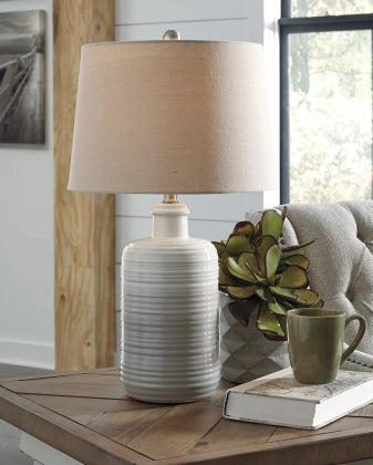 Wowing with shades of taupe and white, this table lamp lights up our world. The glazed, textural base encompasses casual-cool beauty beside any sofa or bed—what a well-rounded pair.