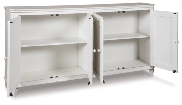 With its distressed vintage paint finish, fluted details and French provincial mouldings, this exquisite cabinet is sure to grace your space in such a très chic way. Adjustable shelved storage is abundantly practical, be it in a dining room, living room or entryway.