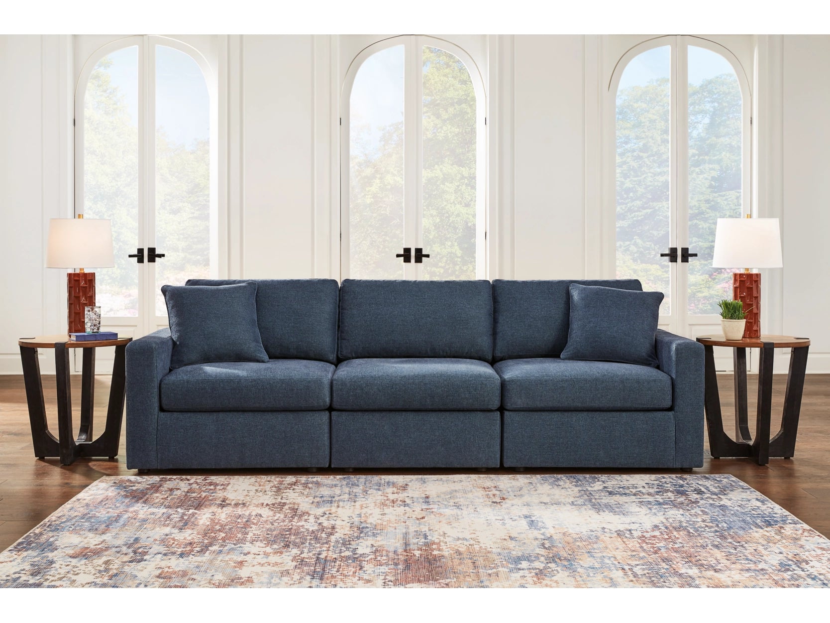 - Includes 3 modular pieces: left-arm facing corner chair, armless chair and right-arm facing corner chair