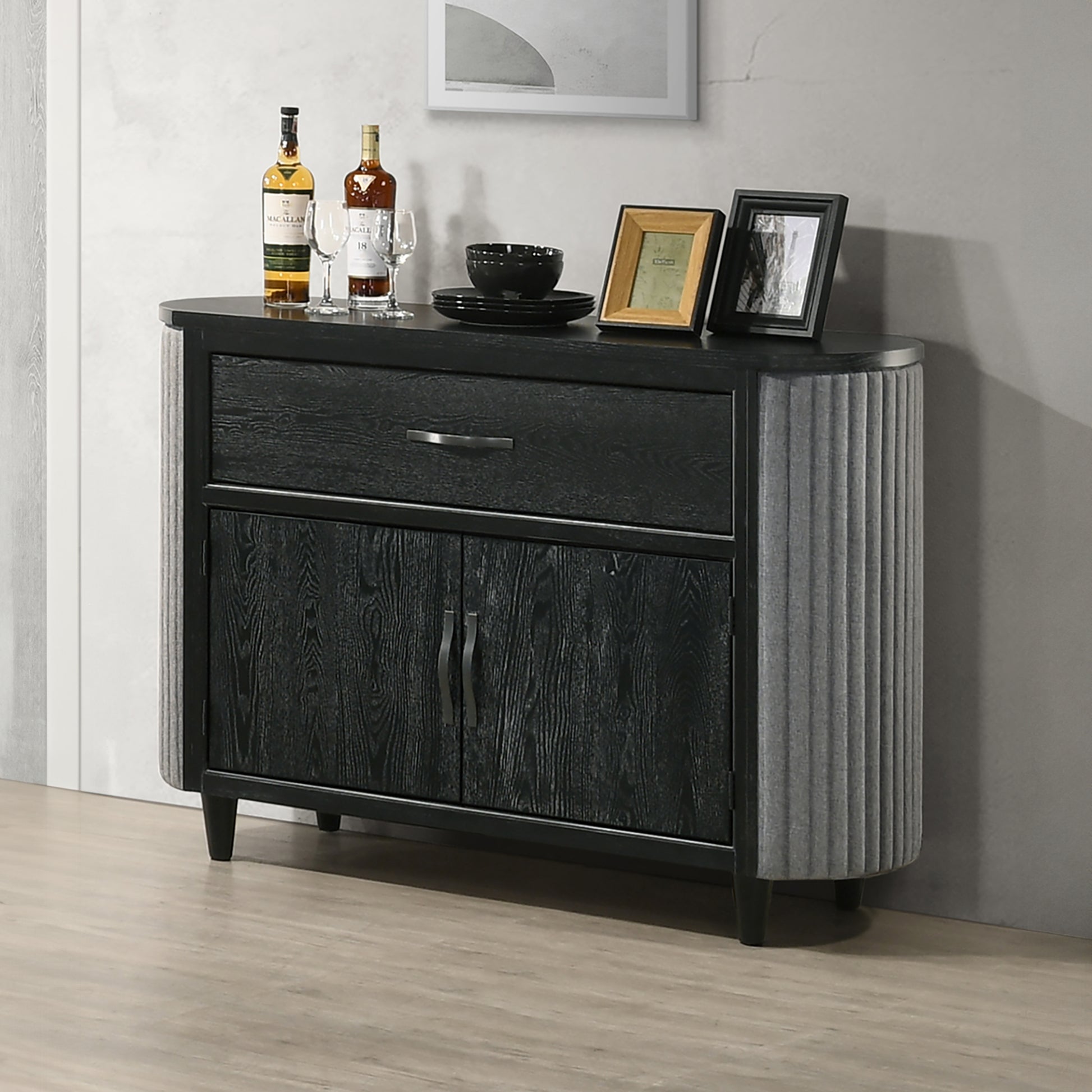 The Skyline Server in Onyx blends modern design with functionality, making it a versatile addition. Crafted from solid Rubberwood, engineered woods, and Ash veneers, it offers durability and style. The Onyx Black finish with gray glazing enhances the wood grain. Textured gray ribbed fabric contrasts elegantly with the dark wood. A spacious top drawer and roomy lower compartment provide ample storage. Ideal as a dining sideboard, entryway accent, or TV stand, it delivers lasting quality and appeal.