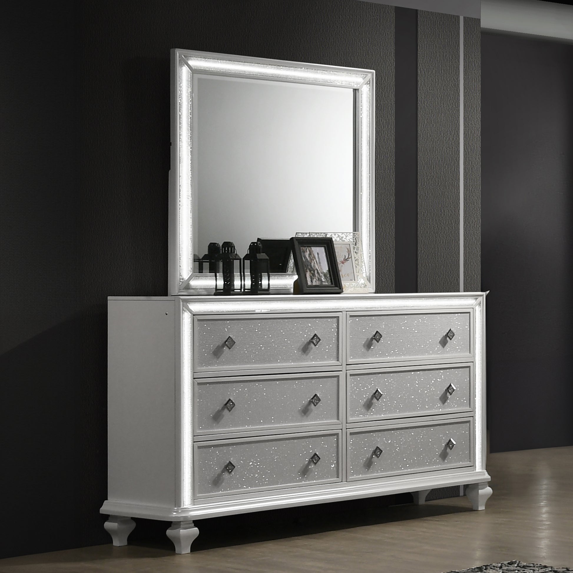 - Sleek White Finish: The contemporary white finish is accented with a dose of glam provided by glittery silver accents.