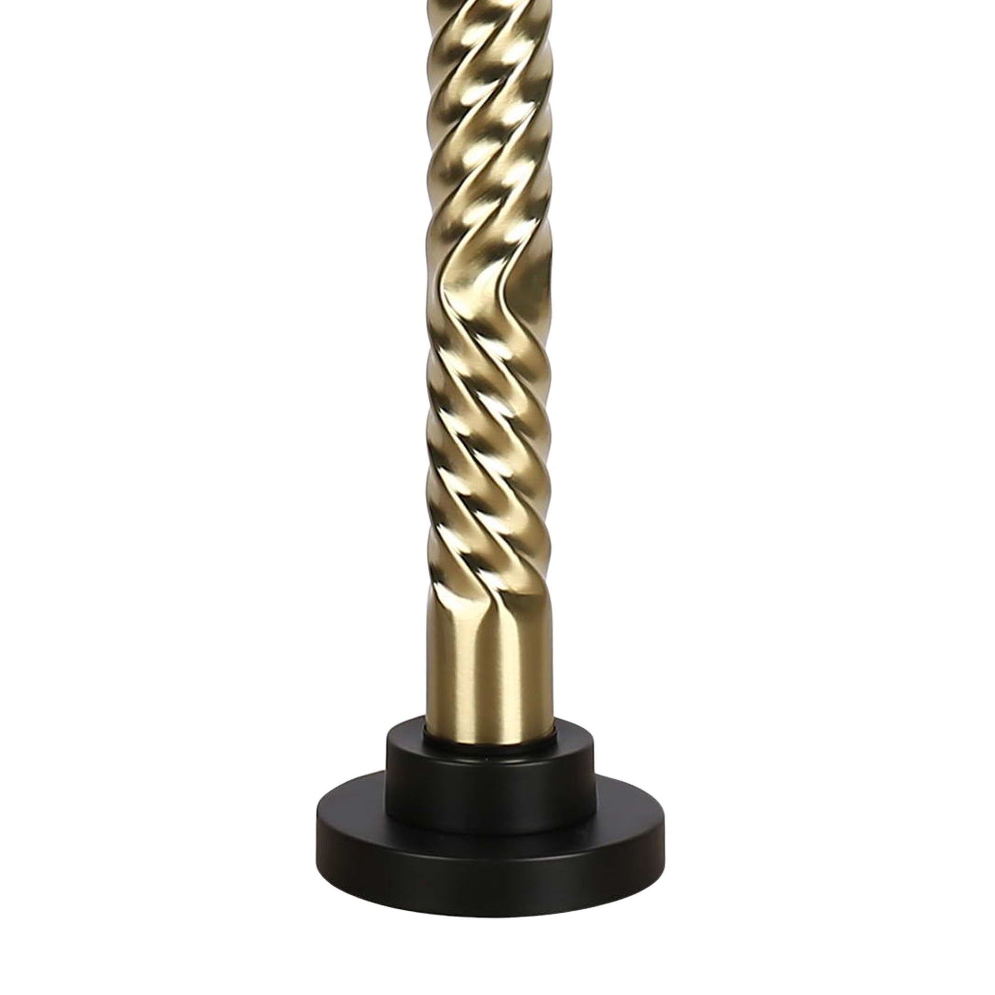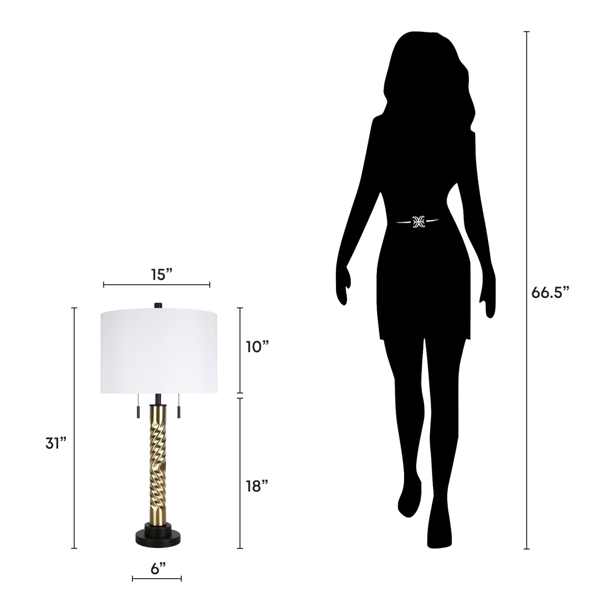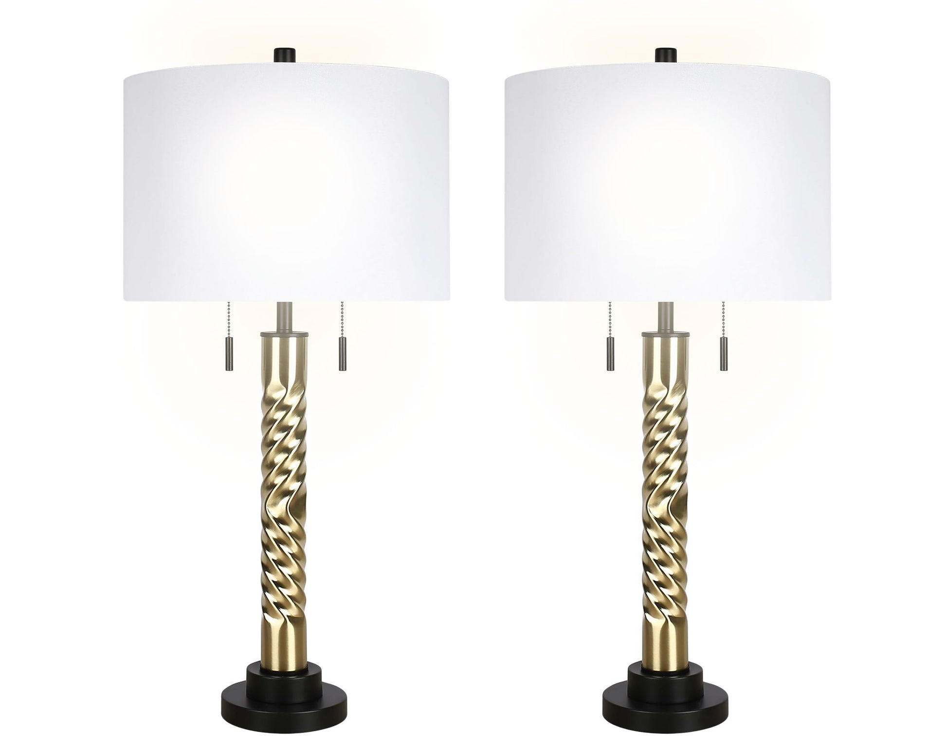 The Twist Elegance table lamp brings a touch of modern sophistication to your home. Its striking twisted column design in soft gold and black creates a captivating focal point, while the white linen drum shade casts a warm, inviting glow. Ideal for nightstands or living room consoles, this lamp set offers both style and functionality with its double pull chain switches.